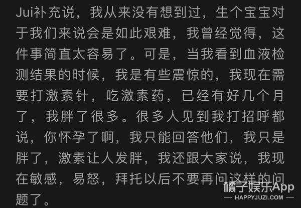 在一次采访中,Jui曾透露她不管去哪都有人问怀孕了吗,自己打激素吃激素药,已经快要奔溃了