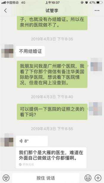李先生的微信信息中备注着,该机构为位于广州市的一家国际助孕医院,但记者在网上并未搜索到该医院的信息,通过国家企业信用信息公示系统查询也显示“查无此院”。记者表示是否可以提供医院的相关证照,李先生解释称“我们是大医院的医生偷偷在外面自己做,这个你要懂。”
