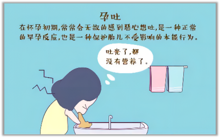 孕妇大部份在前三个月都难免出现不同程度的恶心、呕吐,而且常发生在早上,建议服用止吐药或维生素B6来改善。