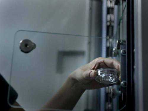 这些是培养箱,它相当于女性的子宫,温度保持在37℃,湿度、二氧化碳和氧气浓度等都参照人体相关指数调节。打开培养箱,每一层隔板上,放着几个透明玻璃皿。这些培养箱就像人造子宫,里面存放着精子、卵子。
