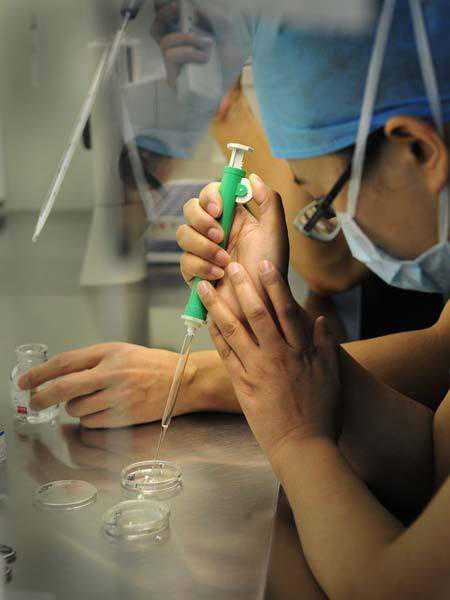 卵胞浆内单精子显微注射成功培植出的胚胎取出后准备临床植入患者